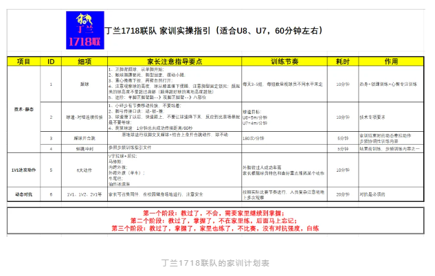 第二是“训赛PDCA+数据化+家训结合”。他会以三个月为一个周期,制定明确的训练主题和计划(Plan)。每节训练课和每周的比赛后,都会进行复盘总结(Check & Action),帮助孩子理解得失。他善于将训练要点思维导图化,甚至通过简单的书面问卷,帮助孩子和家长回顾核心要点,实现“知行合一”。同时,他为每个阶段制定详细的家训指引表,让训练效果从每周有限的集训,延伸到日常家庭生活中,并通过每周与外部球队的约赛或联赛来检验成果。